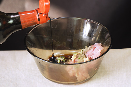3、将肉馅与葱、姜、胡椒粉、白糖、生抽和老抽顺时针搅拌,同时往里面放入凉好的葱油搅拌均匀。