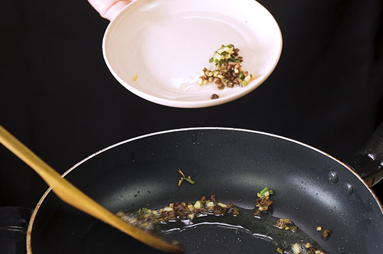 2、起锅烧油,油热后放入切好的葱、姜和花椒,炸出葱油,葱姜略微变糊时关火,再把葱姜和花椒捞出,底油放凉。