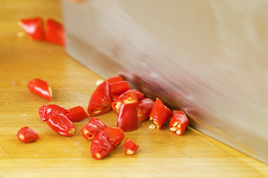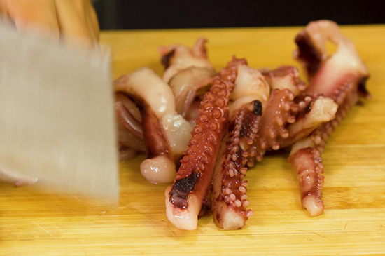 1、鱿鱼洗净后须切段,肉切片,下锅焯水后捞出沥干水分。红辣椒切成辣椒圈,青椒切碎,生姜切片,葱切末,大蒜拍碎备用。