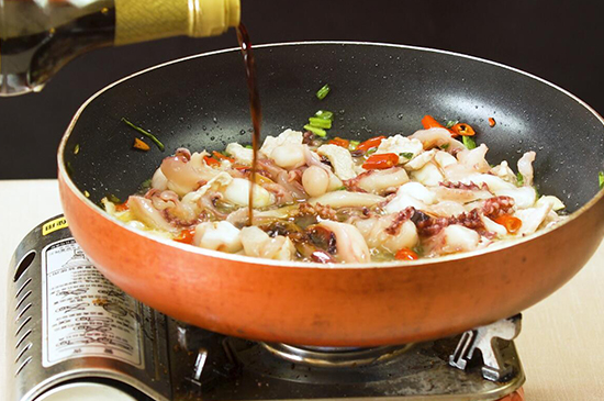 2、起锅烧油,油热后放入切好的葱、蒜和红辣椒炒出香味,再把焯水的鱿鱼和适量白酒放入锅内翻炒去腥。