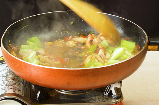3、依次加入生抽、蚝油、辣椒酱和盐翻炒入味,再加入适量水盖锅焖煮一段时间。