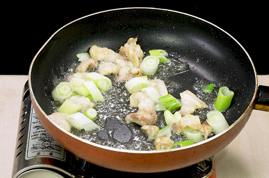 2、起锅烧油,油热后放入五花肉煸炒至金黄色,放入葱段炒出香味。