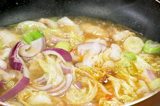 3、依次倒入洋葱片、泡菜、辣酱和水,翻炒均匀后,熬煮至汤汁变粘稠。