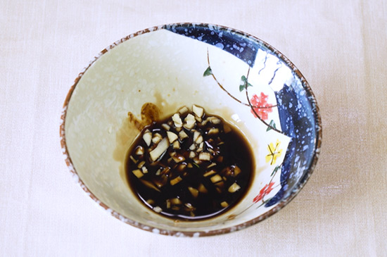 2、将陈醋、白糖、生抽、海鲜酱油、盐和蒜末放入碗内,调匀后制成料汁。