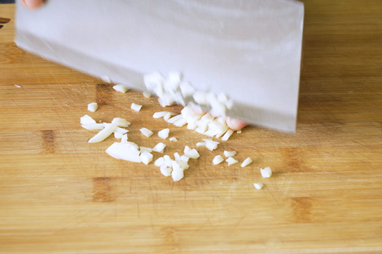 1、白菜洗净后斜切成片,葱切末,姜切末,蒜切末备用,切好的蒜一半下锅,另一半调汁。
