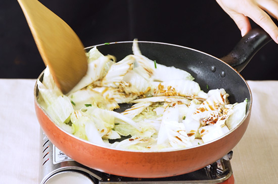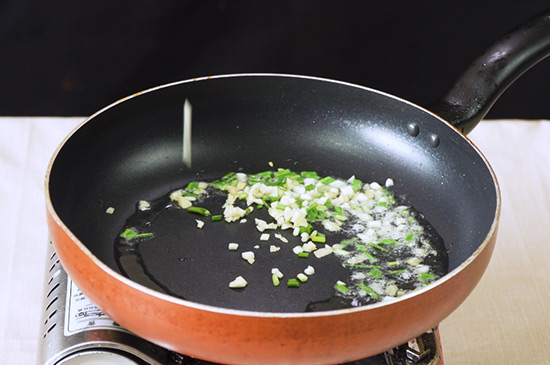 3、起锅烧油,油热后放入切好的葱、姜、蒜炒出香味,再把白菜片放入炒至略微变软。