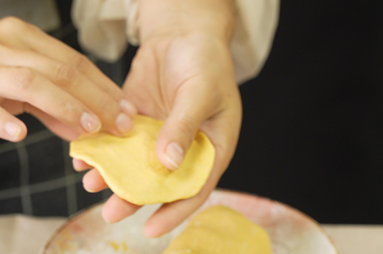3、取一小坨面团捏成中间厚、边缘薄的圆饼,再把白砂糖放在圆饼中间,由边缘向中间收拢圆饼包裹白砂糖后重新按扁。