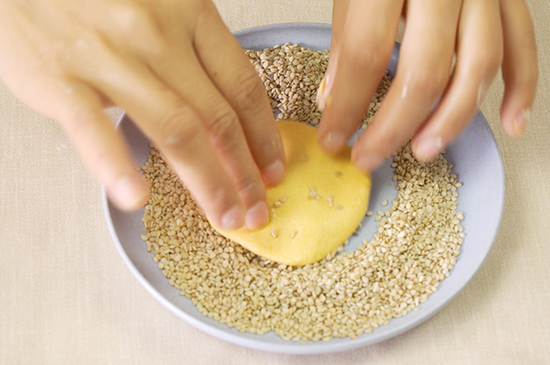 南瓜泥、白砂糖和糯米粉揉捏成面团后,取一小坨面团捏成中间厚、边缘薄的圆饼,再把豆沙放在圆饼中间收拢圆饼包裹白砂糖并重新按扁。最后将圆饼两面都沾上白芝麻,放入油锅内煎至两面金黄,一份美味的南瓜饼就完成了。 南瓜饼的制作方法