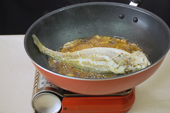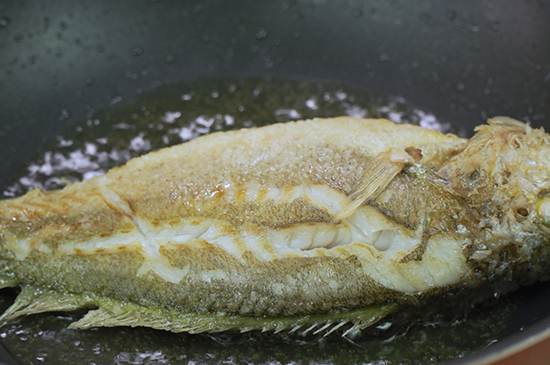 5、最后将炸好的鱼放入锅内大火再次烧开,再转小火慢炖10分钟左右转大火收汁,出锅前撒上葱花,一份美味的糖醋黄鱼就做好了。 |