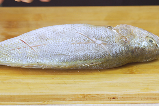1、黄鱼去除内脏、鱼鳃洗净,两面切十字花刀后沥干水分备用。蒜切成瓣,姜切片,大葱切段,小葱切葱花备用。
