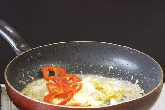 5、最后倒入鸡蛋、红椒、葱段翻炒均匀至红椒断生,美味的炒虾米就做好了。 |