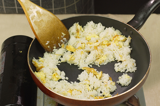 起锅烧油倒入蛋液迅速划散炒至凝固后,往锅内倒入米饭,用铲子将鸡蛋铲碎,同时和米饭翻炒均匀。最后放入适量盐调味,出锅前撒上葱花略微翻炒,美味的蛋炒饭就完成了。 蛋炒饭的制作方法