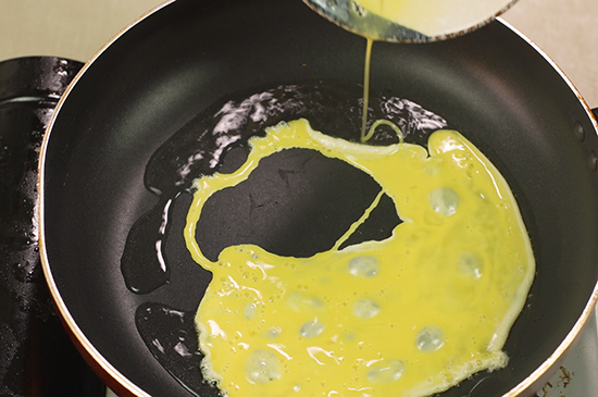 2、起锅烧油,油热后倒入蛋液迅速划散炒至凝固。