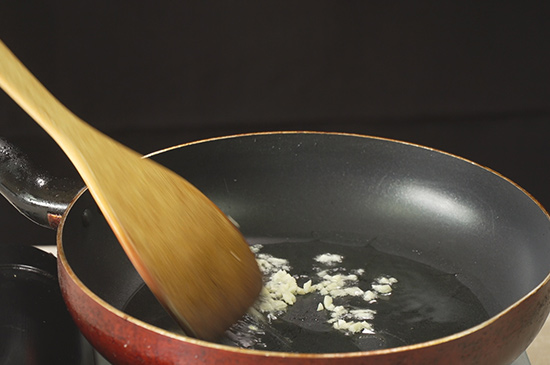 2、热锅倒油,待油微热时,放入一半的蒜蓉,用小火慢慢翻炒出大蒜的香气,煸炒至金黄色。