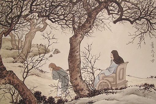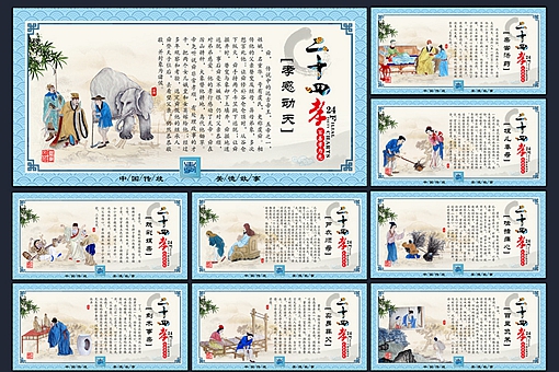 一、旧二十四孝、人物及故事简述 1.孝感动天——虞舜(上古) 相传舜的父母亲都对他十分不满,屡次对他下杀手,但是他依旧孝顺父母。舜的孝行感动了天地,被选作了尧的继承人。 2.戏彩娱亲——老莱子(春秋) 老莱子为了逗自己的父母开心,不惜穿着五颜六色的衣服,手上摇着拨浪鼓,跪在地上模仿小孩的蹒跚学步的样子。 3.鹿乳奉亲——郯子(春秋) 郯子为了治疗自己双目失明的父母,跨越千山万水,披着鹿皮取鹿乳。有一次因为模仿的太像鹿,还差点被猎人射死了。 4.百里负米——仲由(春秋) 仲由是孔子的得意门生之一,他自己在田间挖野菜充饥,却到百里之外负米给父母吃。 5.啮指痛心——曾参(春秋) 曾参有一天上山砍柴的时候,突然感到心脏疼痛。回家后才知道是家里来了客人,母亲不知如何款待,就咬自己的手指,盼望他快点回来。 6.芦衣顺母——闵损(春秋) 闵子骞的母亲是继母,有年冬天,继母给自己亲生的两个弟弟用上好的棉花做衣服,给自已用的是芦花。父亲发现后,要赶继母出门,闵子骞不让。说继母在的话只有自己受冻挨饿,继母走了,那三个孩子都得受冻挨饿了。 7.亲尝汤药——汉文帝(西汉) 汉文帝刘恒的母亲生病的时候,他每一碗汤药都要自己尝过才让母亲服用。 8.拾葚异器——蔡顺(汉朝) 那年正好是王莽之乱,家里没有米下锅,只能吃野果充饥。蔡顺把捡来的桑葚分成两筐,一筐是黑色的,给自己母亲吃。另外一筐是红色的,留给自己吃。