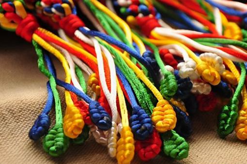 2、五彩绳古人认为五月是“恶月”,端午这一天是最不吉利、最“毒”的日子,所以家家户户都会给孩子系上五彩绳,就是以红、黄、蓝、绿、紫五种颜色编制的绳子。古人认为五色即为五行,是吉利的象征,能够辟邪祛瘟。《风俗通》记载:“五月五”日以五彩丝系臂,名长命缕。