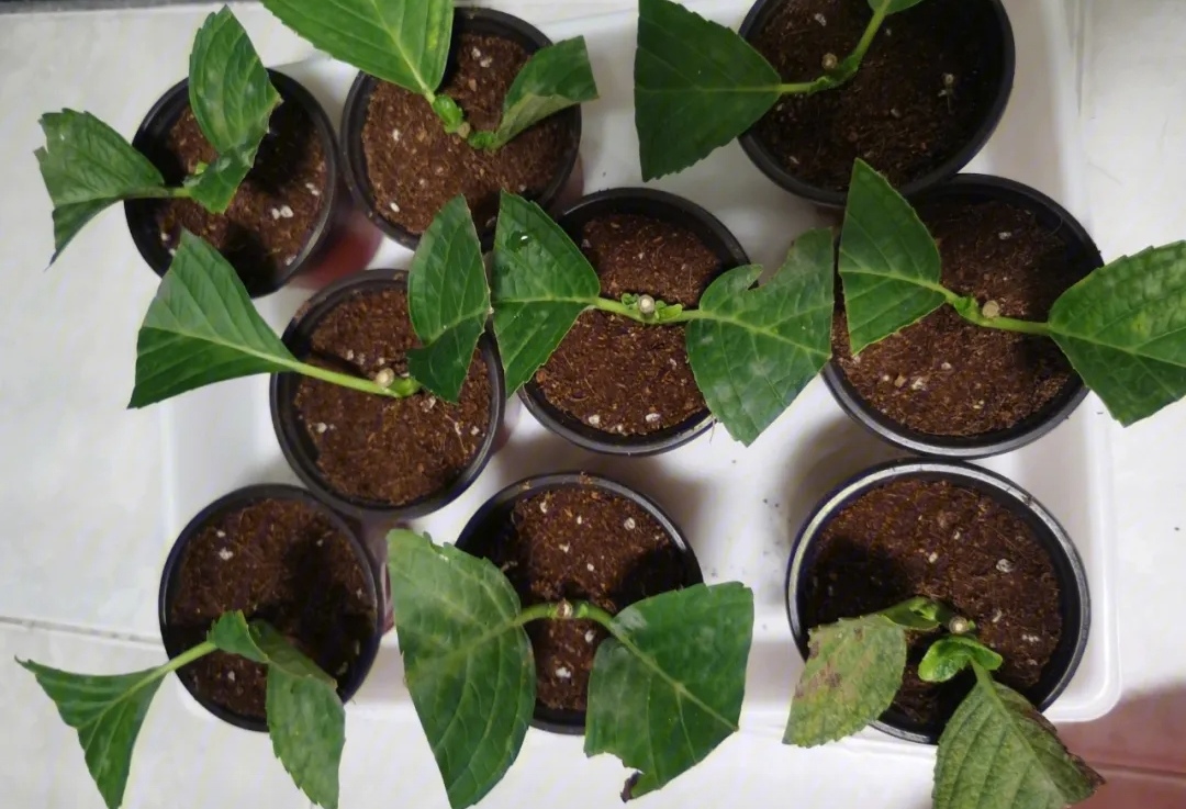 扦插方法 绣球生长速度很快,在扦插的时候,插穗也不用剪的太长,一般8~10㎝即可,顶部留下两片叶子,再将整片叶子剪掉1/3,能进行光合作用就可以,底部同样切斜面。 如果用普通花土扦插老是失败,可以选择用干净的河沙,因为河沙保水,通透性又好,比较有利于植物生根。扦插后放在阴凉通风处,每2~3天去给它喷喷水雾,保持基质微湿,差不多有二十天就能长出新根。