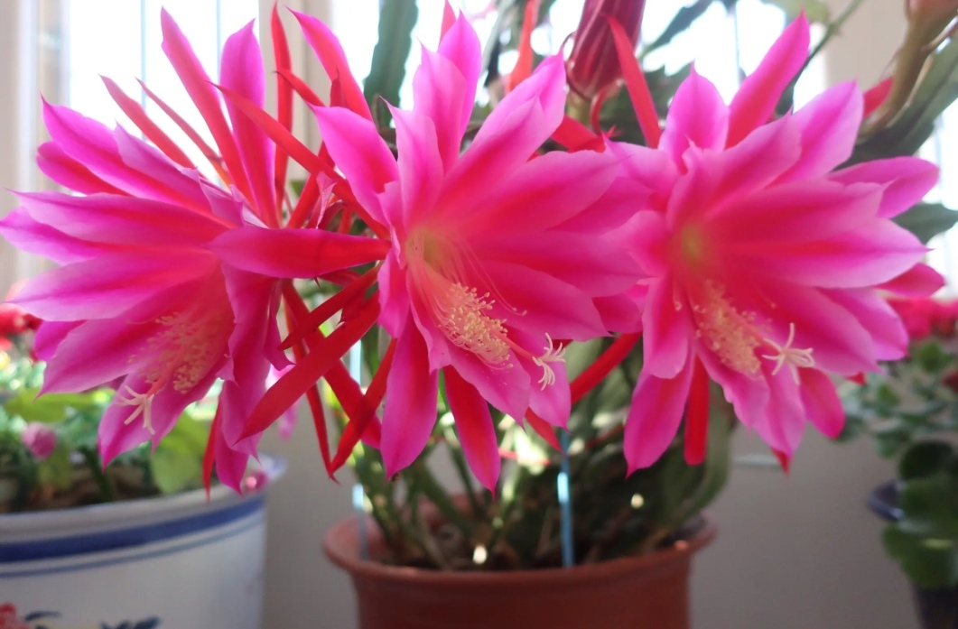 令箭荷花 令箭荷花是一种仙人掌科的植物,生命力顽强,也比较好养,而且它开出的花朵硕大美丽,犹如朵朵圣洁的莲花,一直深受人们的喜爱。 这种花一般在4~6月份开放,当年养的植株可能要等到来年才能开花了。仙人掌科植物生根能力强,可以说见土就活,在春天的时候,可以利用枝条去多扦插繁殖几盆。