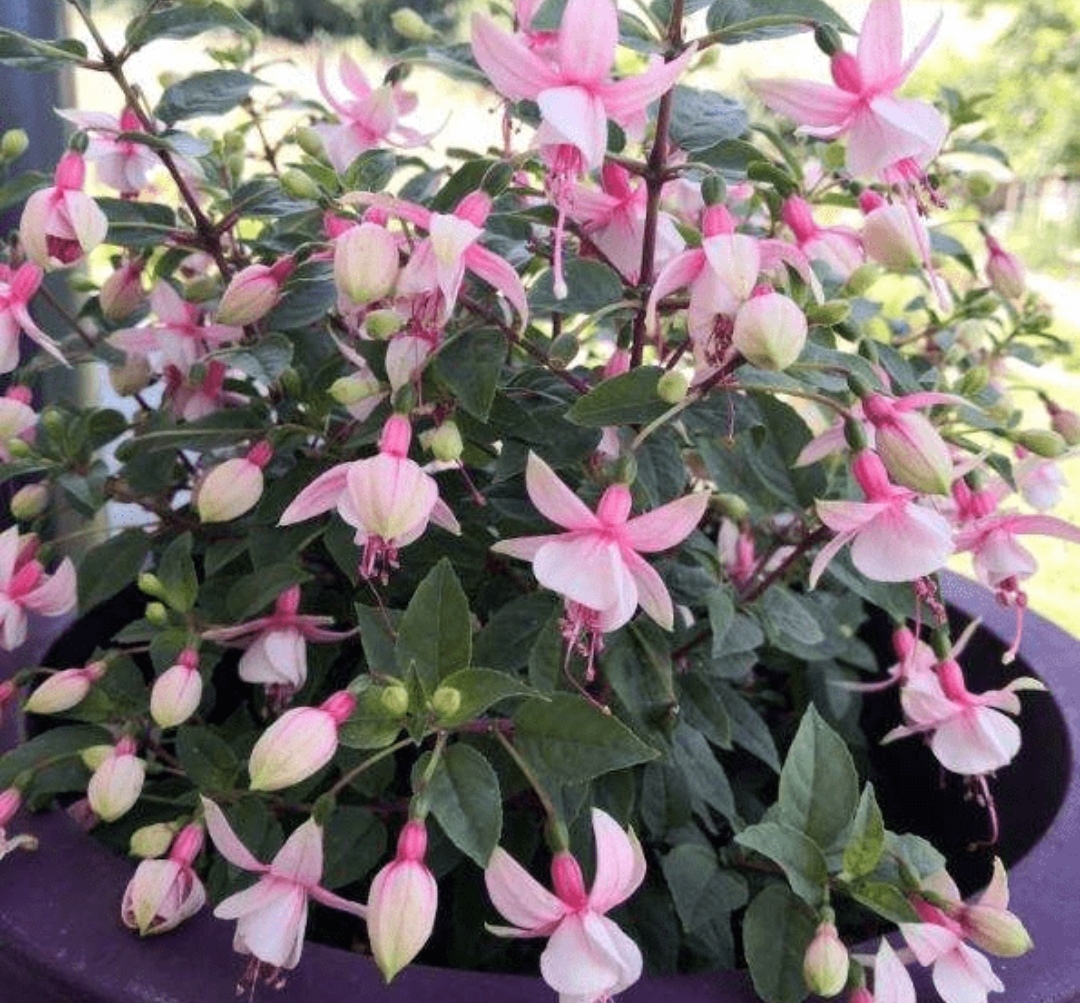 吊挂金钟 天气暖和以后,倒挂金钟也开始生长花苞,这个时候很多花友会把它搬出来晒晒太阳,好为植株增加光合作用。这种花其实是很怕晒的,它喜欢凉爽、湿润的半阴环境,即使孕蕾开花,也只要有一些微弱的光照。