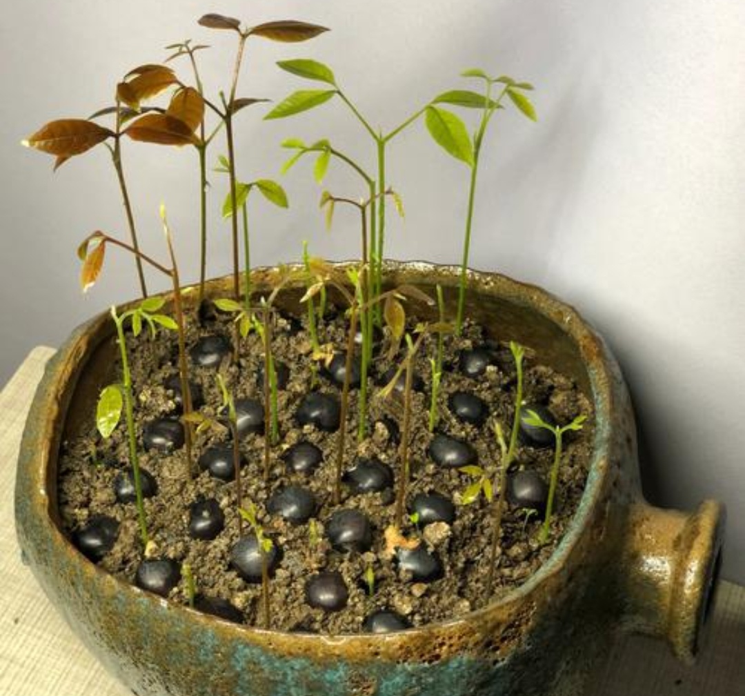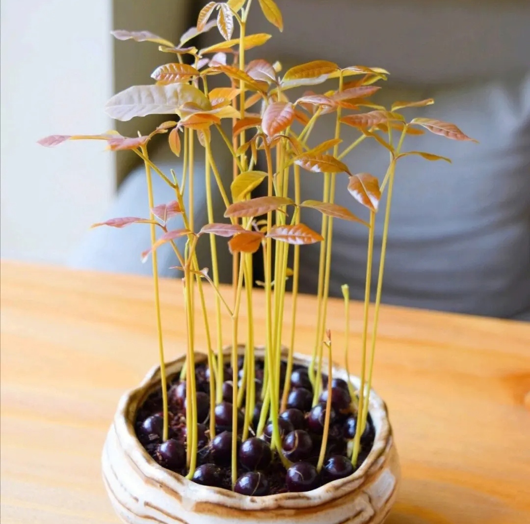 将种子取出来以后,为了能出苗更快,播种前可以先进行催芽,用温水浸泡种子一两天,中间勤换水,就会在顶端萌发新芽。然后再播种到松软透气的盆土中,很快就能长成漂亮的小盆栽。