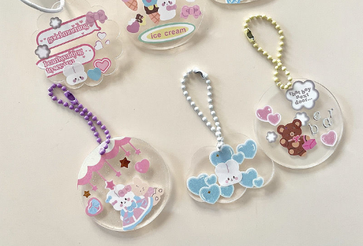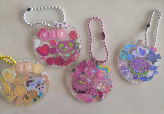 咕卡一般贴几面可以贴一面,也可以贴两面,看个人喜好而定。 做咕卡少不了漂漂亮亮的贴纸。可以买花朵系列和狗狗系列的泡泡贴纸,像一个个大珍珠一样一样,还有烫金字母贴和这种咕卡装饰笔,据说它们是咕卡的灵魂呢!用这种神奇的笔做好装饰,能给咕卡增色不少。把自己喜欢的图案贴在底盘上,可以根据自己的风格任意diy,然后穿上同色系的小链条。