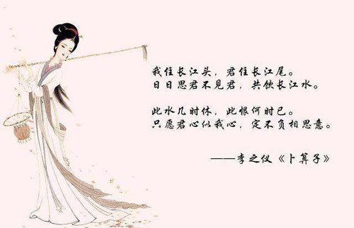 ![]() 译文如下: 我居住在长江上游,你居住在长江尾底。日日夜夜想你,却不能见你,却共同饮着长江之水。悠悠不尽的江水什么时候枯竭,别离的苦恨什么时候消止。只愿你的心,如我的心相守不移,就不会辜负了我一番痴恋情意。 |