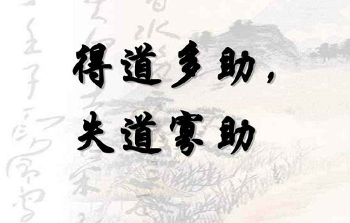 “得道多助,失道寡助”,出自《孟子》。意思是“站在正义、仁义方面的人,帮助支持他的人就多,违背道义、仁义的人,帮助支持他的人就少”。