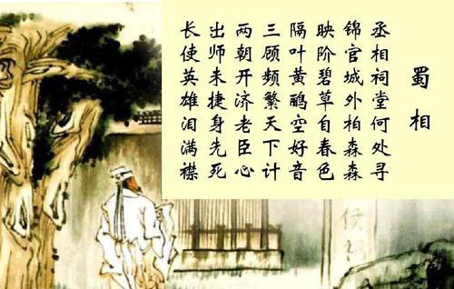 ![]() (1)三顾频繁天下计:刘备为统一天下而三顾茅庐,向诸葛亮问计。这是在赞美在对策中所表现的天才预见。 (2)两朝开济:诸葛亮辅助刘备开创帝业,建立蜀汉。后又辅佐后主刘禅。可谓“鞠躬尽碎,死而后已”,只可惜刘禅是个扶不起的阿斗。 |