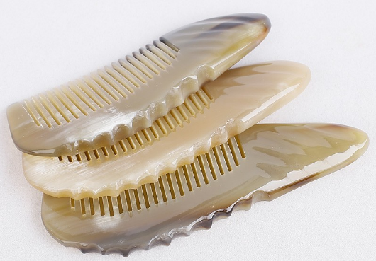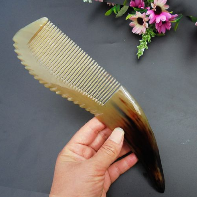 牛角梳怎么挑选1、看牛角梳的材质:目前市场上销售的牛角梳有黄牛角梳、白水牛角梳、黑水牛角梳等几种,其中黄牛角梳和白水牛角梳质量和功效更好一些,黄牛角梳手感温润有质感,厚实耐用,天然的黄牛角还能够去屑止痒、防止白发早生、治疗头痛等保健作用。 2、看牛角梳的长短:内行的人都知道,用牛角角尖部分做的梳子是质量是最好的。最普遍的办法就是尽量挑选尺寸长点的梳子,因为尺寸长的牛角梳,如果不用角的中上部来做,做出来的梳子就会很单薄,一般15-20cm的中大号梳子,都是用角的中上部做的,相同情况下质量要比尺寸短的牛角梳好。 3、看牛角梳的厚度:相信这一点大家也比较清楚,挑选牛角梳应尽可能选择厚身一点的梳子,这样的梳子断裂不容易,而且梳头发时手感更好。 |