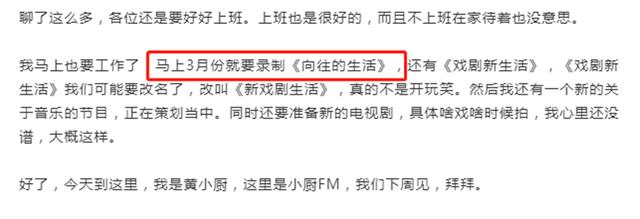 虽说新一季并非是马尔代夫,但全新的海边录制还是让人非常期待,不单单是观众,就连黄磊、何炅等人也是备受期待,其中黄磊更是在自己的“黄小厨FM”中宣布3月即将开始录制《向往的生活》,而彭昱畅也早早曝光了3月的行程,其中3月7日到3月10进行综艺录制,不出意外的话就是《向往的生活》的开录。