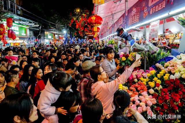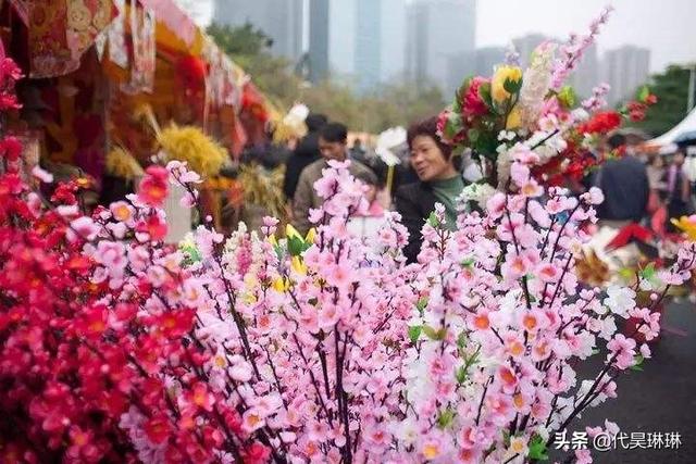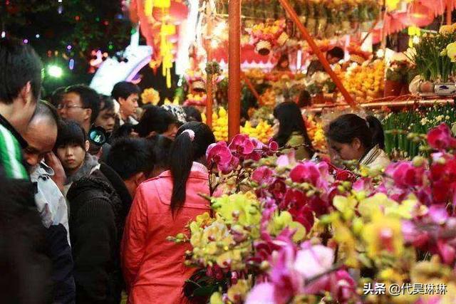 花市 2.在广东,春节不逛花市,似乎就不算是过春节,行花街,逛庙会,以前老人家常说:“行花街就是为了讨个好运气。鲜花象征着花开富贵,金桔代表如意吉祥。”现在行花街除了可以买花、看花以外,更是广州人过年希望“行运”的标志。