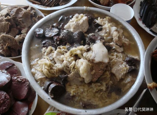 北方春节雪景 在农村,过了腊八之后,人们开始杀猪宰鸡,把猪肉切成块,谁家杀猪都要用酸菜和肥肉、血肠放在大锅里炖,这便是人们常说的 “杀猪菜”。杀猪菜,原本是东北农村每年接近年关杀年猪时所吃的一种炖菜。杀猪菜不怎么讲究什么配料、调料,只是把刚杀好的猪肉斩成大块放进锅里,加入水,放上盐,然后边煮边往里面切酸菜,等到肉烂菜熟后,再把灌好的血肠倒进锅内煮熟。上菜时,一盘肉,一盘酸菜,一盘血肠,也有的是把三者合一,大盆大盆地端上桌来。