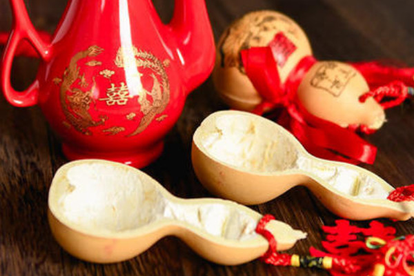新婚夜喝的酒也称为合卺酒,合卺有着结婚的意思,而且南北朝时期,夫妻二人饮用合卺酒,使用的是两个瓢,瓢柄上系有丝带,等待新婚夫妻将酒饮净后,就会将两个瓢扣在一起,使用丝带缠绕,寓意着永不分离。