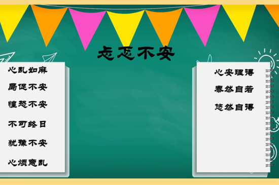 与“忐忑不安”意思相近的有心乱如麻、局促不安、惶恐不安、不可终日、犹豫不安、心烦意乱等汉语成语。与“忐忑不安”意思相反的有心安理得、泰然自若、悠然自得、举止泰然等汉语成语。