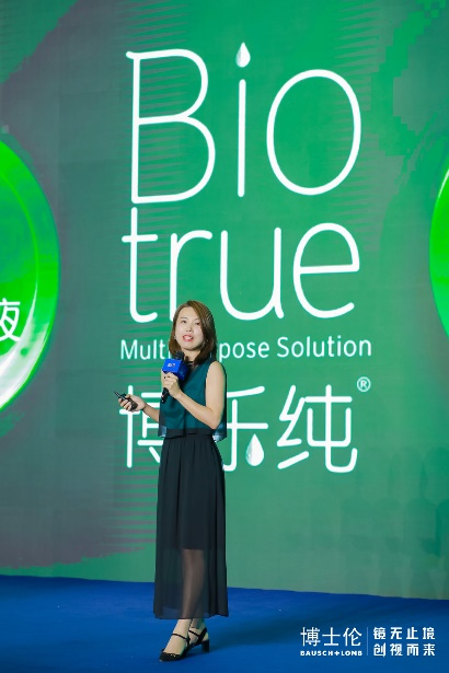 中国视力保健事业部市场经理郭忆作了博乐纯护理液新品“博乐纯臻润”的上市推介。