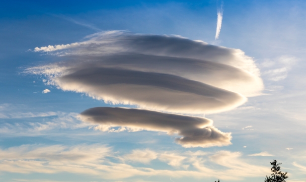 飞碟云的形成是比较简单的,是一种自然的天气。一般都会出现在山脉的上空,形状如同是飞碟,被称之为飞碟云,就好像是不明飞行物。其实这主要是一种自然的天气,如果空气在经过山脉上空时,正好遇到温度下降,此时空气内的水分会慢慢的凝结,然后就会形成荚状云。 飞碟云有时会形成两层,有时会形成更多层,主要的学名是荚状高积云。这一个名字所引用的正好是外观,从外观来看和飞碟比较相似,每一次在出现之前还会形成一种波状,慢慢的会爬到之前的顶部。然后会形成一种与众不同的外观,很有一种震撼力。