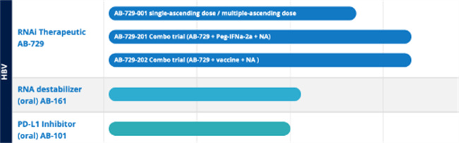在今年4月份的全球肝炎峰会上,Arbutus公司口头报告了一项1b期临床试验(AB-729-001研究)中的一件积极的事情。该试验中,已经停用AB-729和核苷(酸)类似物(NA)治疗的患者保持较低的HBV DNA水平和HBsAg水平,这在阶段试验中是个令人振奋的结果。目前,Arbutus公司正在继续评估AB-729的安全性和耐受性,该研究是一项2a期临床试验(AB-729-201研究),该试验前期阶段初步数据进一步验证了AB-729在调降HBsAg的能力。Arbutus公司预计,将在2023年第二季度公布AB-729 NA IFN组合疗法的初步数据。