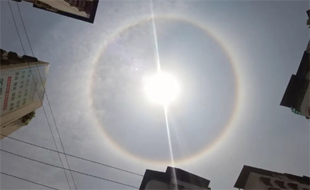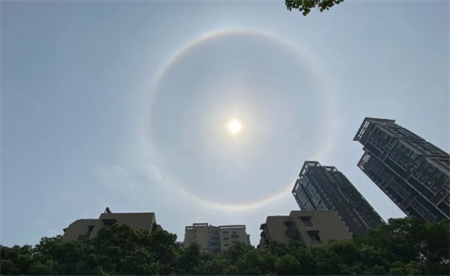 这个光环非常明亮,甚至被网友们形容为“太阳开外挂了”。不仅如此,这个光环也非常大,比平常的日晕要明显得多。因此许多人一看到这个景象,就感觉到异常震撼和美妙。5月13日,武汉上空出现了一幅神奇的画面——日晕。太阳周边浮现出一圈巨大的光环,这个美妙的自然奇观引起了人们的广泛关注。