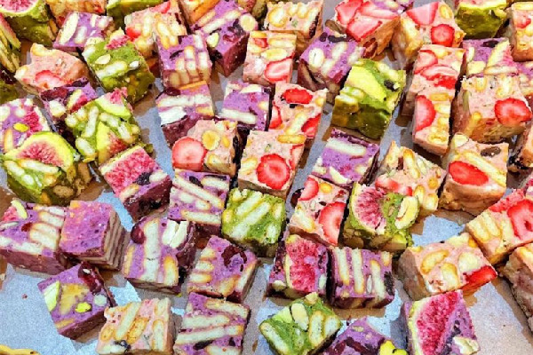 雪花酥怎么吃饼干掰碎,对半即可,不需要很碎(www.ws46.com) 点的火,最小火(全程小火)融化黄油,建议用不粘锅和防高温硅胶铲 黄油完全融合后加棉花糖,慢慢搅动,直至融化 棉花糖融化后迅速加25 g奶粉,搅拌 搅拌5秒后,加饼干碎,充分搅拌,肉眼可见均匀即可,动作要快 容器里放一层硅油纸,撒上5 g奶粉(可提前做好这个步骤),搅拌好的棉花糖饼干融化物放到容器里 选一张干净硅油纸,按压平整(硅油纸不粘)后,表面撒上5 g奶粉 容器放通风处晾凉,大约20 - 25分钟 取出切块,大小随意,散落的奶粉可以放到较深容器里,或者保鲜袋中,倒入切好的雪花酥,充分拌匀,让雪花酥四周都沾满奶粉 |