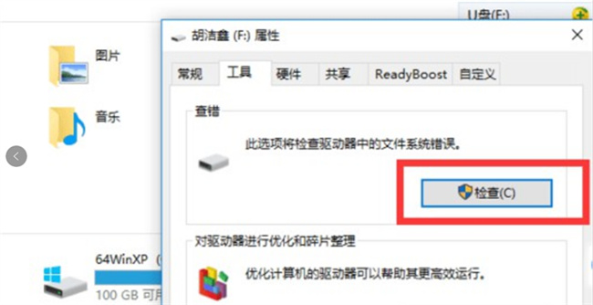 2,打开属性窗口后,找到切换工具的选项并打开,再点击检查选项便会自动检查u盘问题。