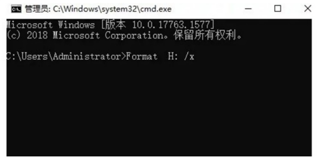 5.进入页面后,输入“Format H: /x”点击回车键即可,其中的H代表着u盘,/r的意思是强制下卷,这样即可完成强制格式化。