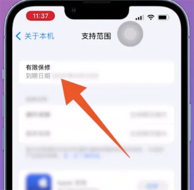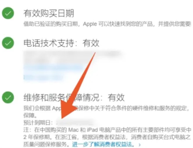 4. 打开新界面后,在维修和服务保障情况的选项中会显示到期时间,之后把这个时间往前推一年就是iphone的准确激活时间。