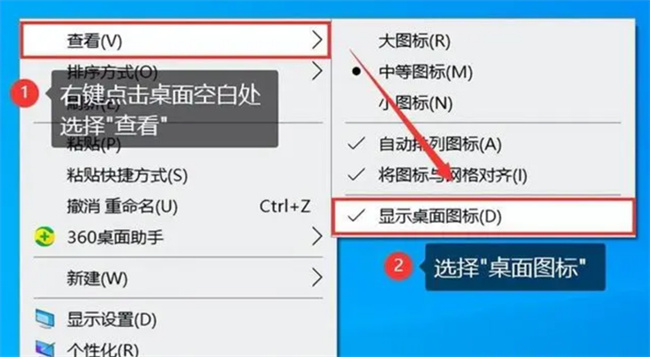 很多人在使用电脑时会经常遇到桌面上图标突然不见或windows桌面整体消失等情况,关于这个问题的解决方法有很多种,下面就给大家来介绍几种较为简单实用的解决方法。 方法一 检查桌面图标是否被失误操作而隐藏,只需右键桌面的空白处,然后选择“查看”选项,之后就可以再右侧菜单中找到“桌面图标”功能,勾选即可恢复隐藏图标。