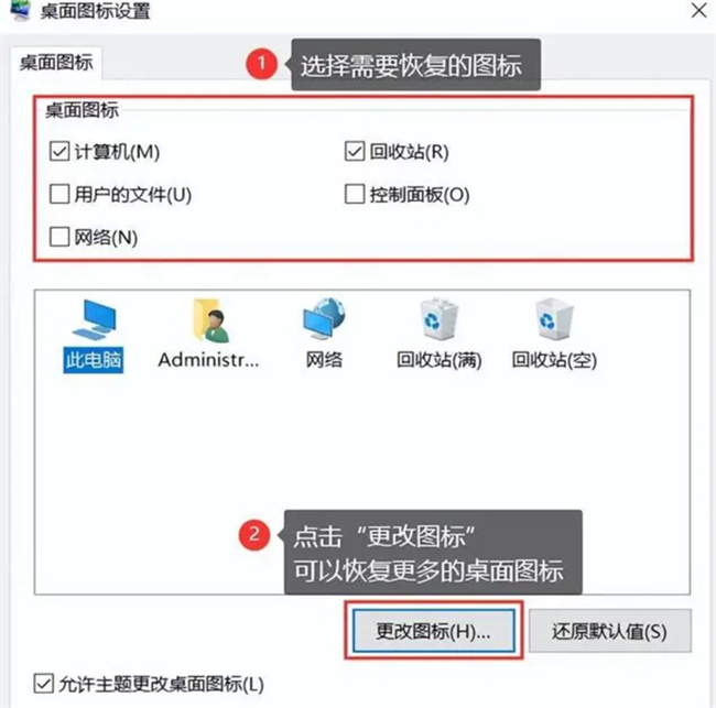2. 在弹出的“桌面图标”页面中选择需要恢复的图标后,单机确定选项即可完成恢复,如果想要更改图标也可以点击相应选项来设置。