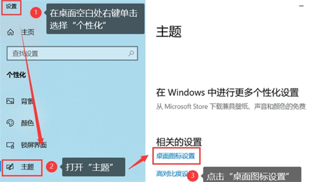 方法二 1.如果桌面图标是被删除或转移到其他文件,可以右键点击桌面,然后选择个性化选项,再点击“主题”功能,打开新的页面后再点击“桌面图标设置”。
