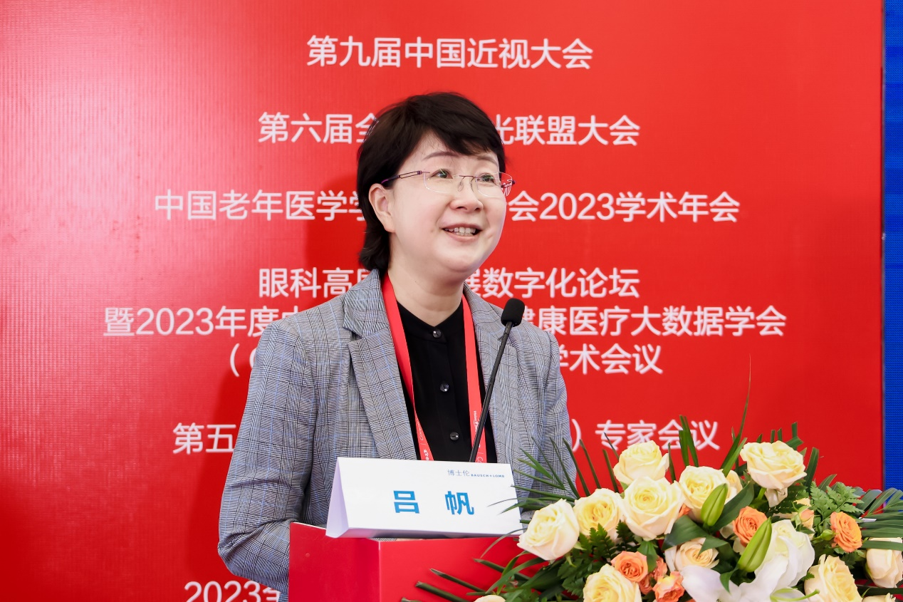 【接触镜的发展趋势与眼健康】 首先,吕帆教授致开幕辞,代表大会主办方对此次学术专场会议顺利召开表示祝贺并向到场的嘉宾、眼科专家老师们表示诚挚由衷的感谢。 吕帆教授谈到:关注全民眼健康和未来的发展是眼视光行业的热点话题,溯源分析现阶段眼健康人群是创新发展的基石。在中国整个社会发展历程中,眼健康需求已经发生改变,博士伦持续不断地创新推出符合发展趋势的新产品,为配戴者提供更多的优质视力解决方案,包括眼干人群、功能性视力矫正、近视防控以及眼科术后治疗的解决方案等。水润科技和健康舒适科技突破了硅水凝胶的瓶颈,创新一代硅水凝胶可达16小时水润,维护眼表平衡,保护稳定泪膜,为散光人群、老视人群、眼科临床提供更优化的解决方案。我们共同期待更高科技更加创新材质的全方位满足配戴者需求的软性接触镜,为广大配戴者提供更佳的配戴体验。