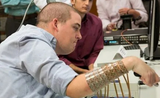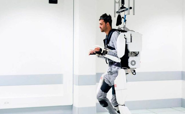 这项技术的核心是电子传导装置,这个装置可以将脑部发出的信号通过无线传输到头盔的传感器上,再用计算机算法转化为指令,通过脊椎处植入的装置控制腿部和脚部的肌肉。这样,患者就可以控制肌肉,重新行走。