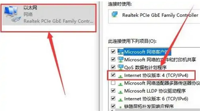 4.在新的窗口中,右键点击以太网选项,并点击属性中的Internet协议版本4(TCP/IPV4)。