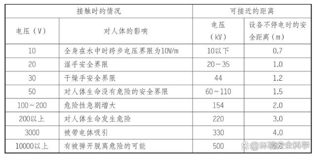 3.常见的触电原因 (1)违章冒险。如在严禁带电操作的情况下操作,而冒险在无必要保护措施下带电操作,结果是触电受伤或死亡。(2)缺乏电气知识。如在防爆区使用一般的电气设备,当电气设备开关时产生火花,而发生爆炸。又如发现有人触电时,不是及时切断电源或用绝缘物使触电者脱离电器电源,而是用手去拉触电者等。(3)输电线或用电设备的绝缘损坏。当人体无意触着因绝缘或带电金属时,就会触电。电压对人体的影响及可接近的最小距离见表。