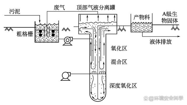 此工艺将3个独立的功能区放置在1个反应器内进行。井筒的最上部是第一级反应区,包括同心通风试管和用于混合液体循环的再循环带。在第一级反应区的下部是混合区,空气注入该区域,为空气循环提升提供动力。井筒的底部是第二级反应区域。该井式高压反应器井径为3m,井深一般约100m。